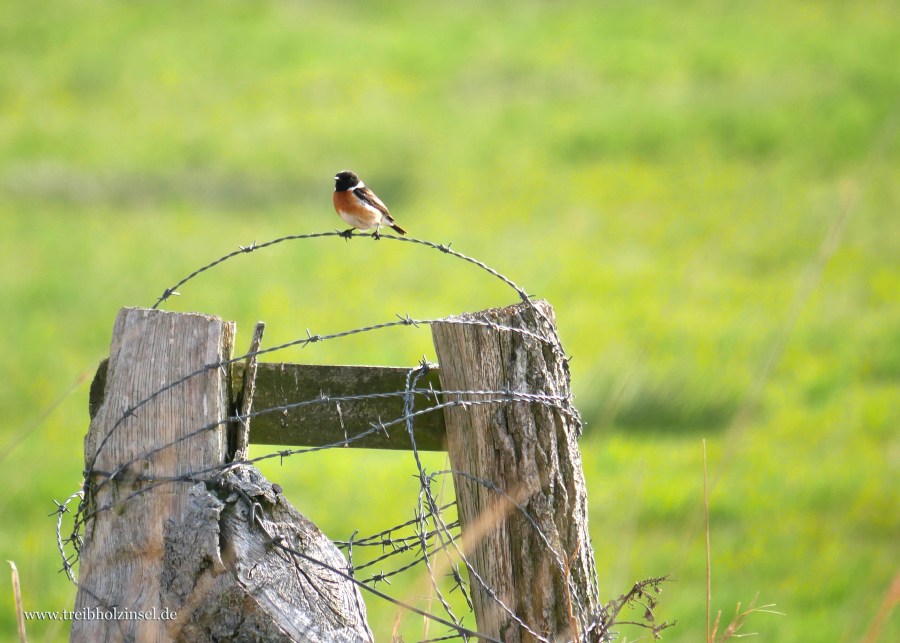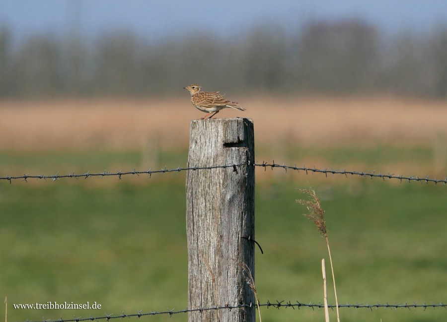Selbst auf der Rückfahrt über die furchtbarste Landstraße Vorpommerns gibt es noch einiges zu entdecken. Auf den Holzpfosten hocken Schwarzkehlchen, Braunkehlchen, Wiesenschafstelzen, Wiesenpieper und Feldlerchen. Wenn man – so wie ich nicht – über ein Spektiv oder ein Objektiv mit größerer Brennweite verfügt und wenn man nicht Ende April, sondern Ende Mai den Anklamer Stadtbruch besucht, dann ließe sich diese Zusammenstellung an Arten noch um einiges verlängern.