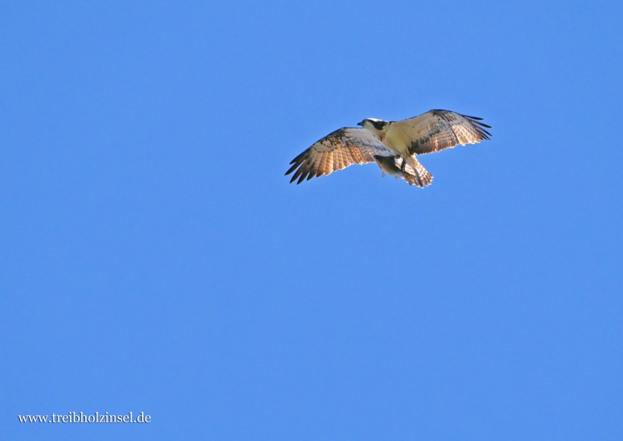 Am Turm dann der Fischadler. Er ist wunderschön und fliegt dicht über unsere Köpfe hinweg. In der typischen, nacheinander gestellten Beinhaltung trägt er einen schönen Fisch fort, dessen Identität sich meiner Kenntnis allerdings entzieht. Hier über den Wasserflächen kann man die Fischadler sehr schön bei der Jagd beobachten, wie sie sich fallen lassen, dann wieder auffangen und rütteln, gleitend oder flügelschlagend die Polder absuchen.