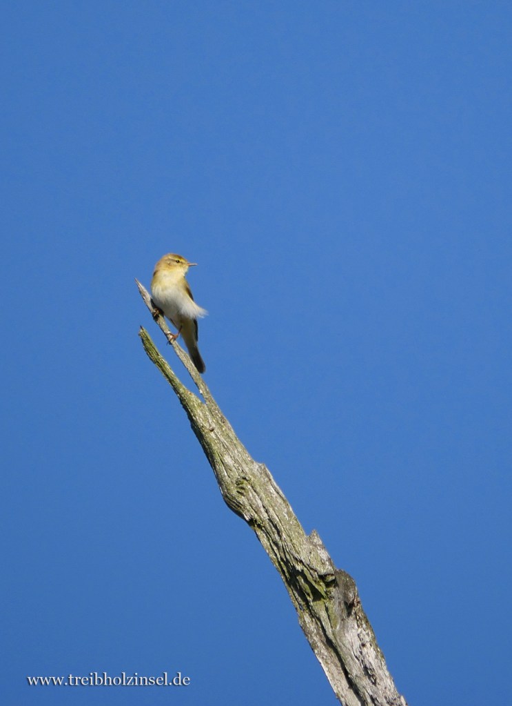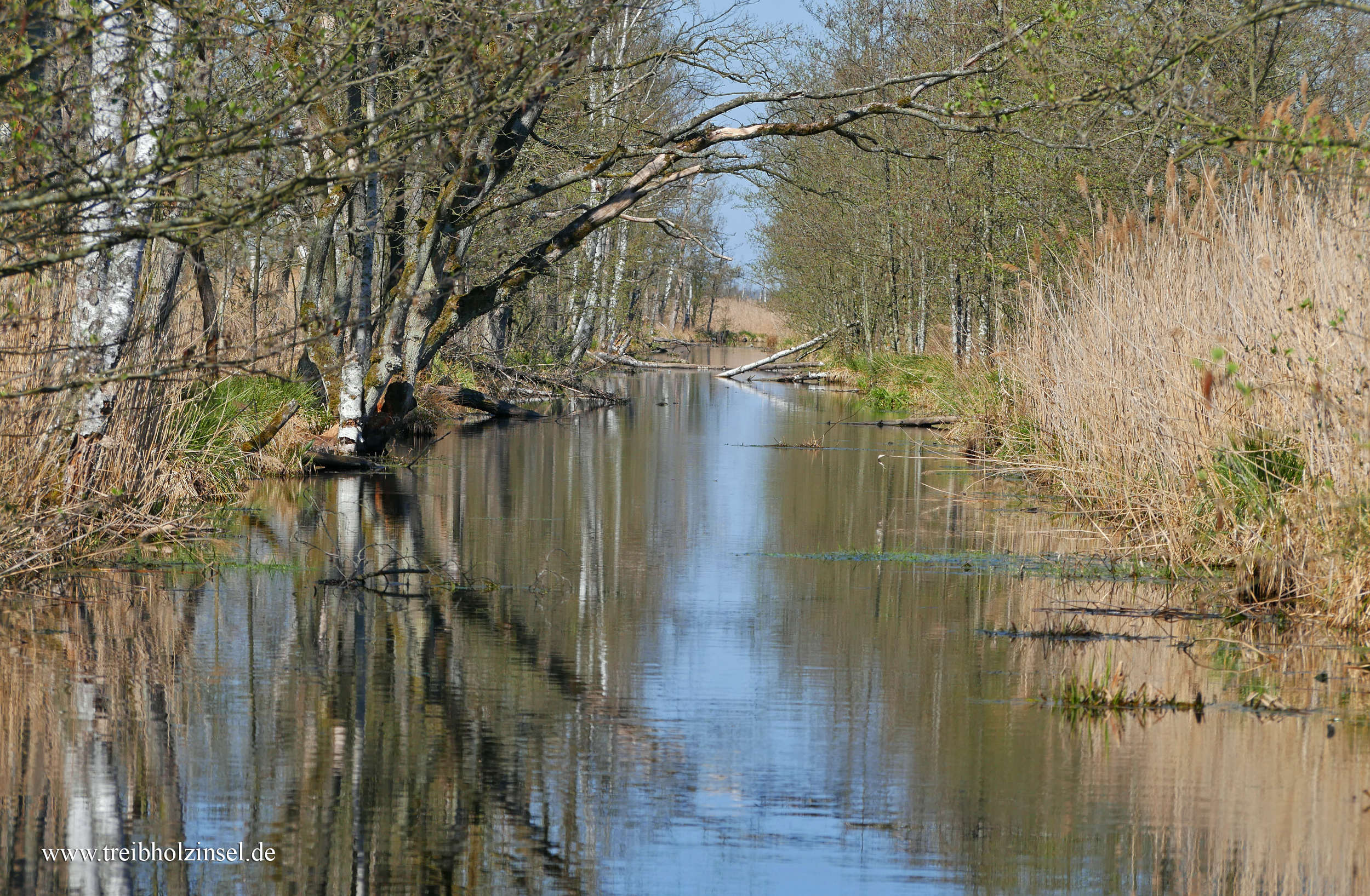Wir waten durch die Lachen und lauschen den Fitissen, die in den Gebüschen wetteifern. Gut einen Kilometer geht man zwischen Schilf, Weiden- und Erlengebüsch und totem Wald dahin, bis man nach Zartenstrom gelangt, wo sich der Naturlehrpfad nach Süden wendet. Rechter Hand ist nun der Bruchwald und links eine schaurig-schöne Mischung aus überwucherten Torfstichen, Kanälen, Röhricht und Baumgerippen. Man überquert bald darauf den Westtorfkanal über eine schwimmende Brücke. Auf einer Warte am Kanal hockt ein Blaukehlchen. Vier Goldammern huschen über den Weg. Aus dem Bruchwald schwebt ein Seeadler über den Kanal Richtung Haff davon. Ich verfolge seinen Flug, bis er hinter dem Schilf abtaucht. Hinter der ersten Brücke ändert sich der Weg kaum, rechts der Wald, links das Schilf. Rohrweihen kreisen darüber. Zilpzalpe, Fitisse, Amseln ringsum. Wir erreichen die Große Kuhle, eine Art Schilfmeer wo einst der größte Torfstich im Stadtbruch war. Man kann sie von einem Beobachtungsturm aus überschauen. Die Weite des Schilfes ist so immens, dass der gegenüberliegende Waldrand nur ein schmaler Streifen am Horizont ist. Ich habe gelesen, irgendwo dort befindet sich ein weiterer Seeadlerhorst. Ohne Fernglas oder Spektiv bleibt dies für mich jedoch ein Geheimnis.