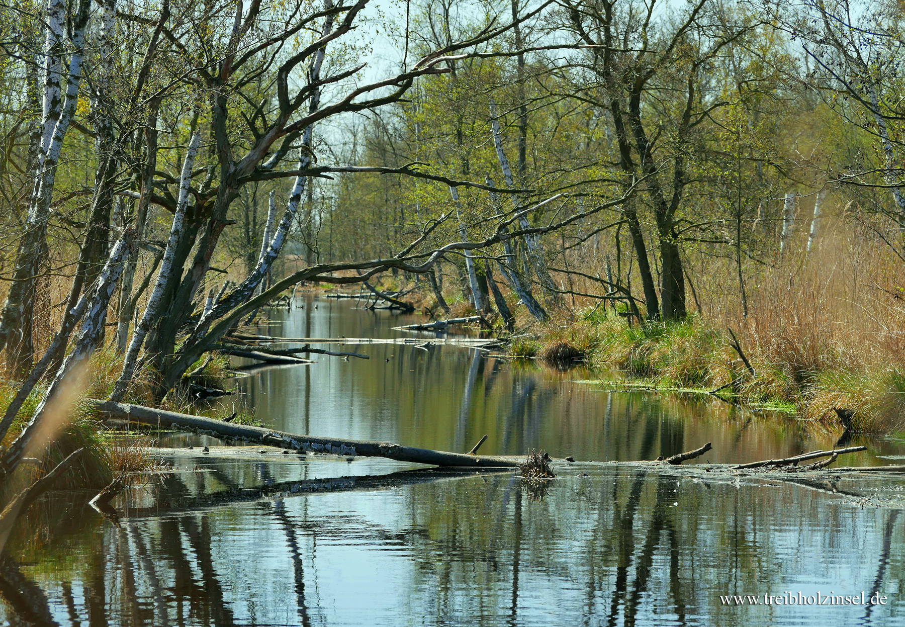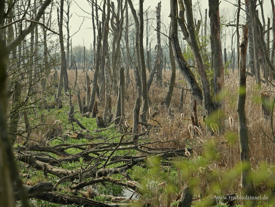 Ein kurzes Stück geht es nun durch Birkenwald und dann gelangt man an die zweite Brücke über den Mitteltorfkanal. Stieglitze rangeln um dieses Revier. Ihr lautstarkes Zwitschern klingt ein bisschen wie der Versuch, den richtigen Kanal auf dem Funkgerät zu finden. An den Fließen sieht man noch die Überbleibsel der alten Brücken, rostige Gestänge aus schwarzem Metall. Der Weg bahnt sich nun schnurgerade durch ein Schilf, das allmählich in toten Wald übergeht. Unverkennbar haben hier Biber gearbeitet. Kaum ein Baumstamm, der noch intakt ist. Die konischen Stümpfe ragen aus dem vertrockneten Gras, die Stämme liegen kreuz und quer dazwischen. Man fragt sich unweigerlich, ob der Biber eine Art Rausch erlebt, während er nagt und nagt und seinem Ziel immer näher kommt, und dann knirscht es und knarzt, und er denkt vielleicht „oha!“, zitternd und bebend vor Spannung, dann kippt der Baum, der Biber schaut zu, es wird still und das Tier stellt fest: zu groß, der ist zu groß, den krieg ich ja gar nicht weg, und geht nach Hause…