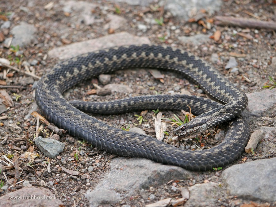 Langsam arbeiten wir uns auf dem Damm voran, entdecken Brandgänse, ein kleines Waldbrettspiel, die ersten Laubsänger in den Bäumen und eine Kreuzotter. Nein, eigentlich entdecken Ephraim und Jane die Kreuzotter. Kurz zuvor war ein Ford Ranger über die Schotterpiste des alten Bahndamms an uns vorbei geknirscht. Ihm ist es geschuldet, dass die Kreuzotter, die sich wohl auf dem warmen Weg gesonnt hatte, das Zeitliche segnen musste. Trotzdem stehen die Kinder verzaubert vor der kleinen Schlange, bestaunen die winzigen schwarzen Augen, das kleine, zierliche Schnäuzchen und die grau und schwarz gemusterte, schuppige Haut. Ihr kindliches Bedauern über den Tod der kleinen Kreuzotter ist herzerweichend, weil es so aufrichtig und doch unbekümmert ist. Was ist schon Tod, fragt sich der fünfjährige Verstand und findet keine Antwort. Trotzdem bin ich nicht sicher, was wohl geschehen wäre, hätte das Schlangenherz noch gepocht. Zwei Knirpse allein mit der Kreuzotter…