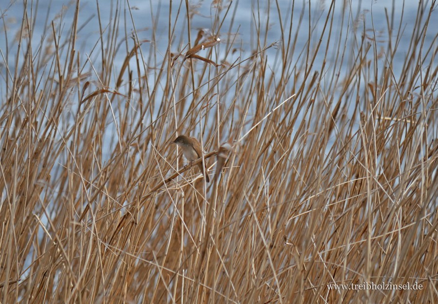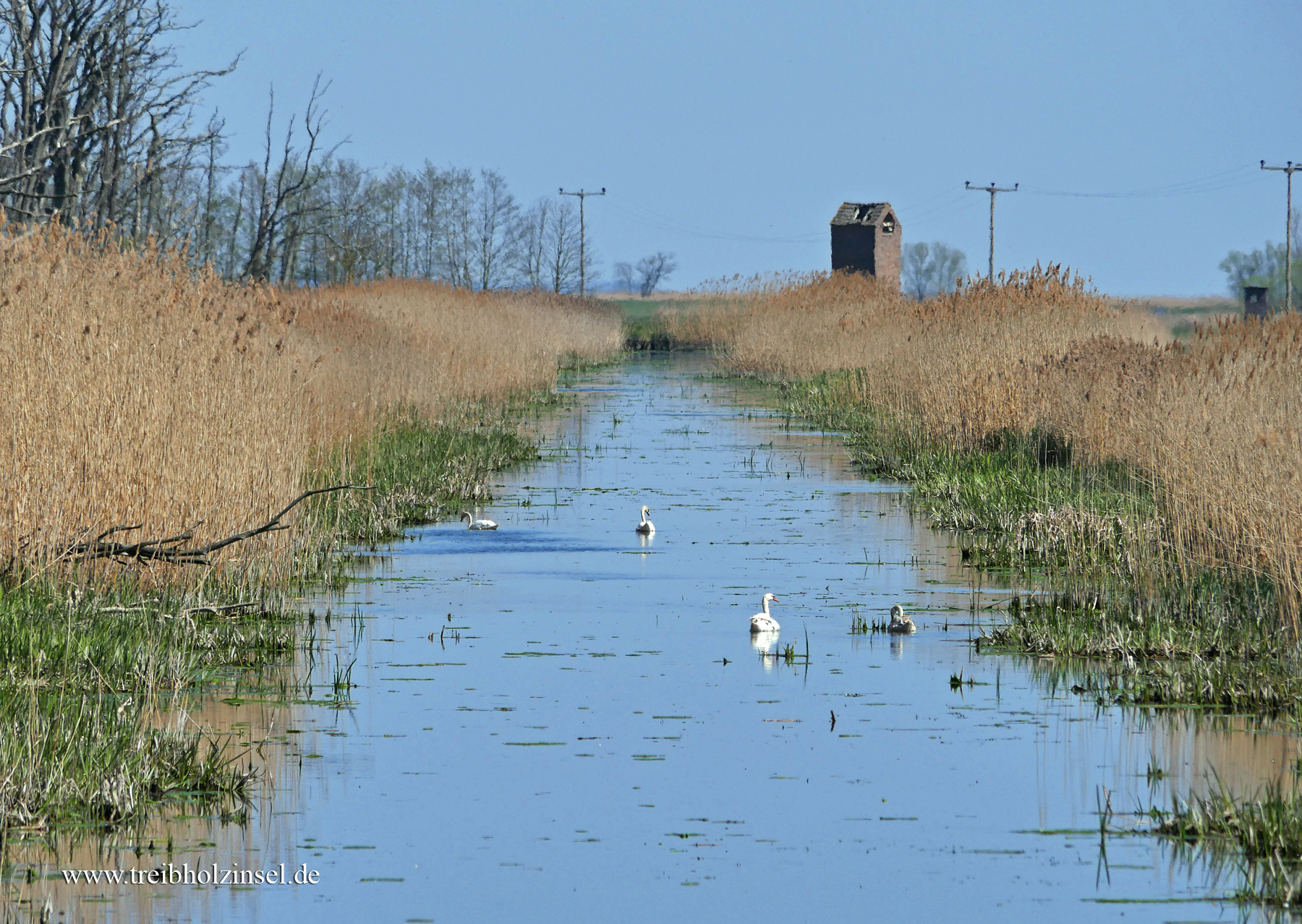 Zartenstrom heißt das Gebiet im nordöstlichen Teil des Anklamer Stadtbruchs, dessen überflutete Polder bis an die Große Kuhle reichen, einem mit Schilf zugewachsenen Torfstich zwischen Westtorf- und Mitteltorfkanal. Ich bin hier mit Bärbel unterwegs, die mich zu Jahresbeginn auf der Treibholzinsel (meine Facebook-Seite) besuchte und auf die prima Idee des gemeinsamen Vogelgucks kam. Und da stehen wir nun auf dem alten Bahndamm und schauen angestrengt ins Schilf, aus dem es rhythmisch schnarrt. Ein Rohrschwirl turnt zwischen den Halmen auf und ab. Dazwischen verharrt er, dreht den Kopf immer im Wechsel nach links und rechts und gibt dabei sein surrendes Lied von sich. Den ersten Kilometer bis hierher haben wir in einer satten Stunde mit Fischadlerbeobachtungen herumgebracht. Zuvor zog das Teichhuhn am Beobachtungsturm unsere volle Aufmerksamkeit auf sich, weil es lieblich aus dem Röhricht blubberte, ohne sich blicken zu lassen. Und davor fesselte uns auf dem Turm der elfenhafte Flug der Mehlschwalben, die zwar auch pfeilschnell sind, aber beim Anflug unter das Turmdach mitunter wie in Zeitlupe im böigen Wind schwebten, dass man versucht war, die Hand nach ihnen auszustrecken und sie zum Niedersitzen einzuladen.