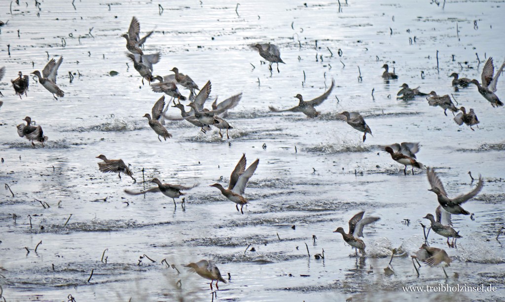 In den Standgewässern trudeln Enten – Schnatterenten und Pfeifenten, aber auch Löffelenten und Krickenten. Ihr unbekümmertes Schnattern weht aus den Wiesen zum Deich herauf. Gut versteckt hinter den hohen Halmen der Schilfgräser gründeln sie in den glitzernden Flachgewässern, immer wachsam und auf der Hut. Vom Deich aus versuche ich eine Blickachse durch den Uferbewuchs zu erhaschen und verliere mich einmal mehr in der Weite des Tals, über dem der Himmel immer irgendwie tief zu hängen scheint. Wie Tupfen auf einer grünen Leinwand ragen alte Weiden aus der Landschaft, bilden hier und da kleine Haine oder Hecken mit Wildsträuchern oder schnüren entlang von Weidezäunen und Wassergräben. Gelegentlich mischen sich weiße und braune Tupfen der Kuhherden darunter und vom Deich aus kann man Dutzende Rehe durch das Tal streifen sehen. Über uns kreisen Bussarde und auch Seeadler, umgaukelt von Kolkraben oder Nebelkrähen.