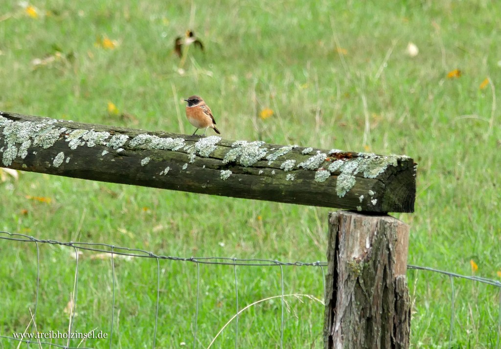 Zu den Stammgästen einer Auenlandschaft zählt das Schwarzkehlchen (Saxicola rubicola). Die kleinen, wenig scheuen Vögel präsentieren sich gerne auf Warten wie Weidezäunen und Wildgehölzen in Gewässernähe.