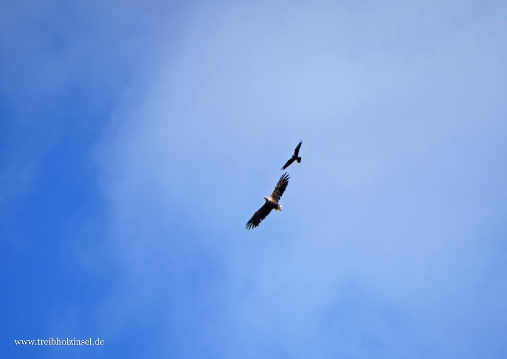In den Poldern stehen hier und da Kraniche. Dazwischen ziehen Rehe über die Wiesen, verschwinden in den mit Schilf bewachsenen Gräben oder in den Wildhecken. Ich sehe über mir den Tanz eines Kolkraben mit einem Seeadler, so fein aufeinander abgestimmt, als würden die beiden nicht zum ersten Mal so dahingleiten. Auch Mäusebussarde gibt es reichlich, jeder ein Unikat durch eine ganz individuelle Gefiederzeichnung, so dass man eine seltsame Lust entwickelt, von jedem ein Foto zu machen und die Vielfalt der Federkleider für alle Zeiten festzuhalten.