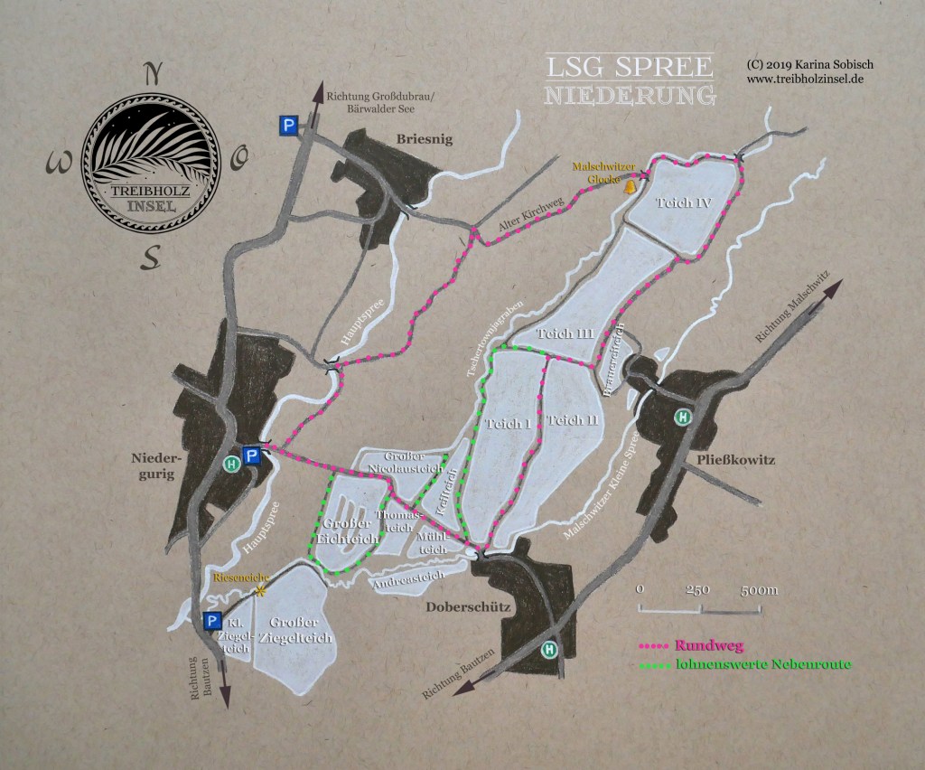 Im Herbst 2018 wurde eine Brücke, welche die Malschwitzer Kleine Spree zwischen Großem Ziegelteich und Großem Eichteich querte, binnen zwei Tagen abgerissen. Dadurch sind die Rieseneiche und die Ziegelteiche derzeit nur von der Bundesstraße aus zu erreichen, statt vom Radweg aus. Das Ganze ist ein trauriges Schauspiel aus diffuser Rechtslage, vielschichtigen Besitz- und Grundstücksverhältnissen, eigenartigen Interessenlagen und deutscher Bürokratie. Wer Nerven hat, kann sich aus den folgenden Zeitungsberichten ein Bild und vielleicht auch eine Meinung machen…