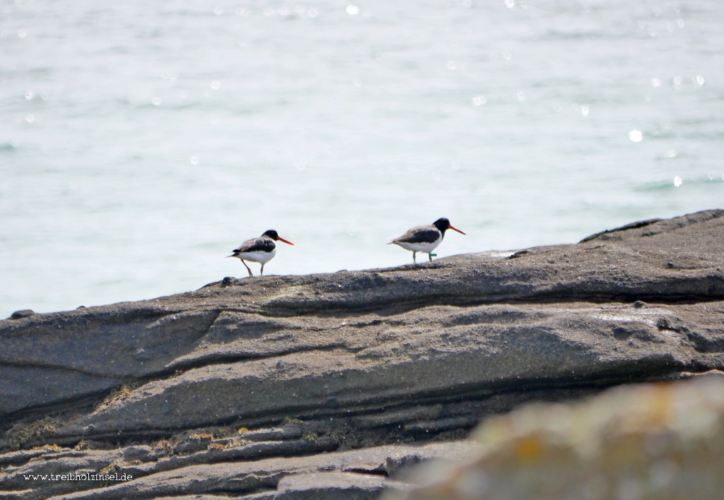 Auf den Felsen, die von der Anhöhe aus zum Meer abfallen, hocken Rabenkrähen und Brandgänse. Hier und da huscht ein Paar Austernfischer vorbei. Sie sind hier seltsam still. Ihr charakteristischer Pfeifruf, den ich vom Wattenmeer gewohnt bin, erklingt den ganzen Tag über nicht. Noch hat die Brutzeit nicht begonnen, doch schon jetzt hocken die oft viele Jahre als Brutpaar verbundenen Vögel zu zweit an sonnigen Plätzen in Wassernähe.