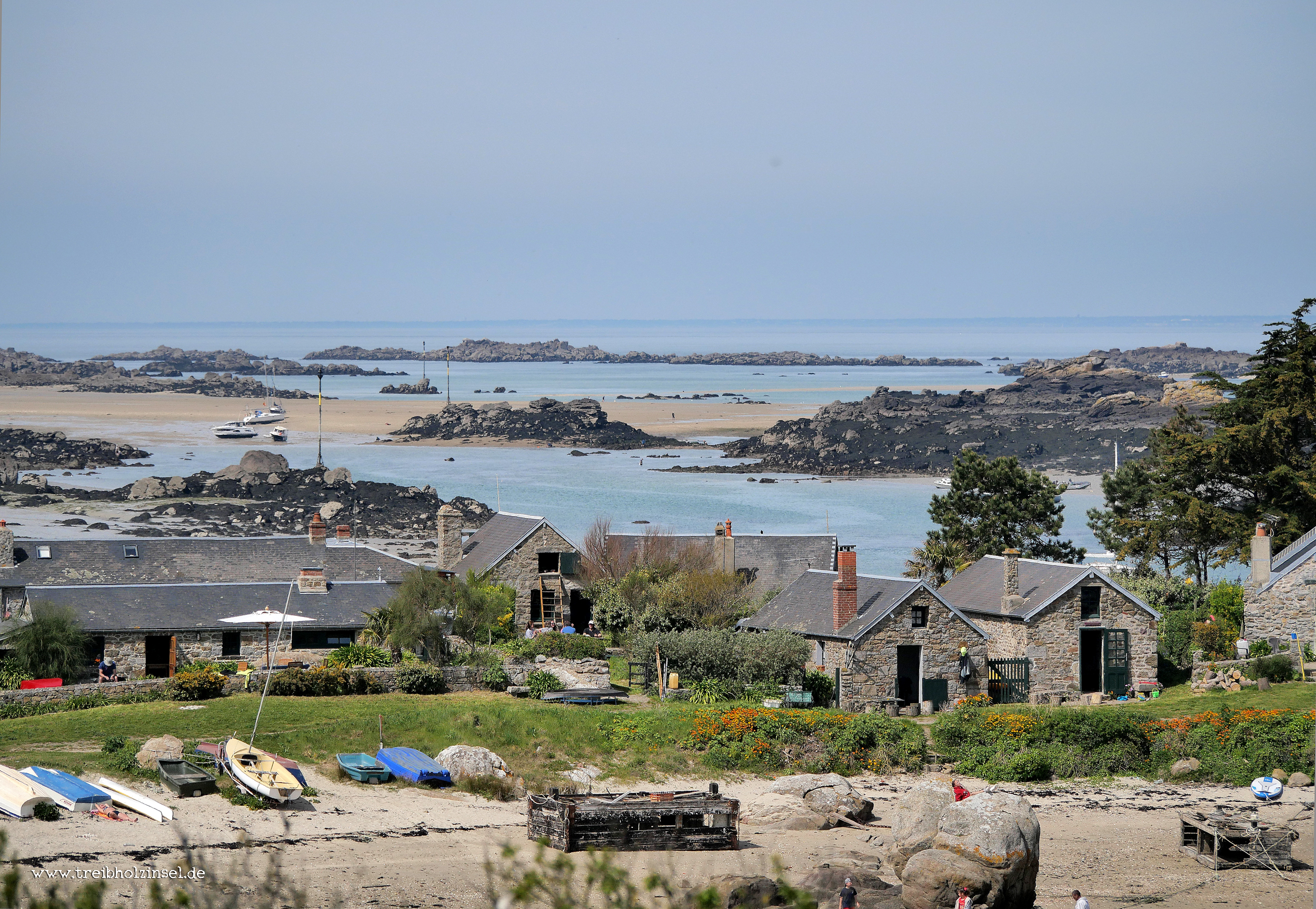 Auch ich verlasse den Anleger nun, zunächst in Richtung Süden. Der Weg führt vorbei an einigen kleinen Häusern aus Naturstein, einer Wiese und einem großen, schattigen Garten, hin zum Strand von Port-Marie. Zwischen dunklen Felsen fällt der goldgelbe Sandstreifen leicht zum Wasser ab. Nichts deutet in diesem Augenblick darauf hin, dass sich das Meer bald weit zurückgezogen haben wird. Vierzehn Meter beträgt der Tidenhub auf dem Archipel, und da Ostern ist und damit Vollmond, gibt es kräftige Gezeitenströmungen.
