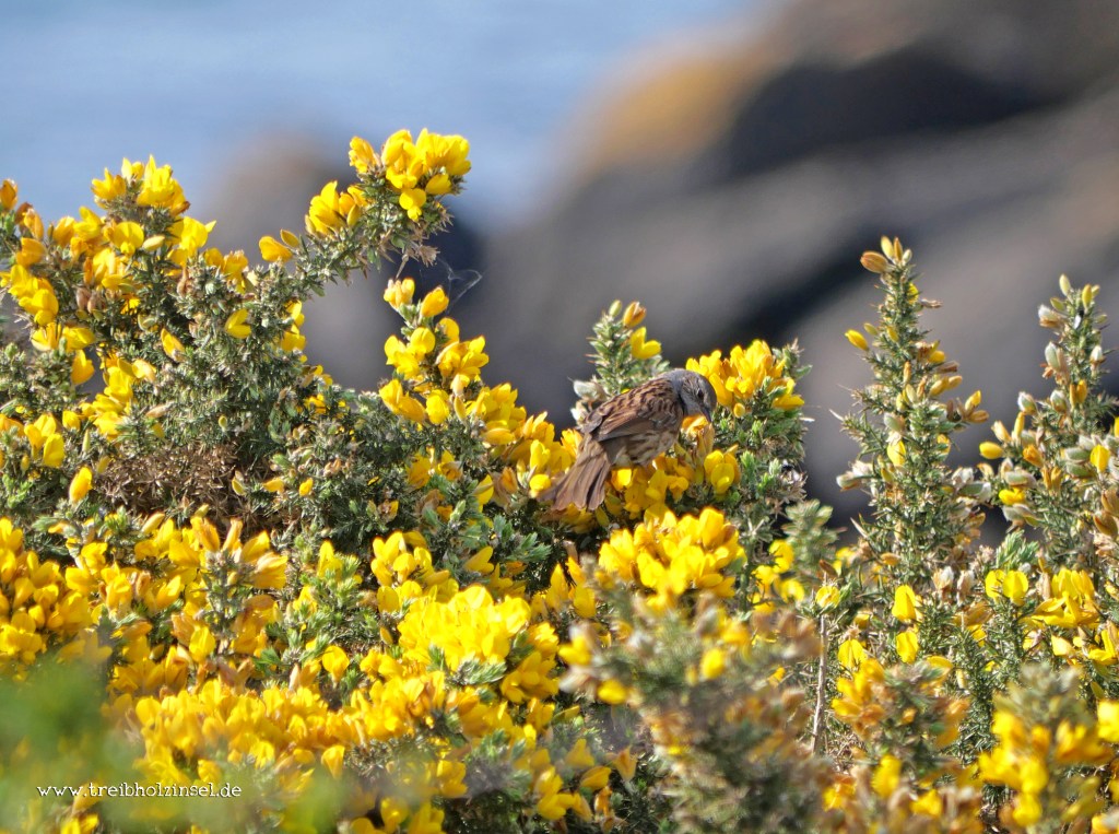 Vom Strand aus führt ein Pfad durch Ginstergebüsch auf eine Anhöhe. Der Stechginster, der überall an den Küsten des Golfs wächst, bietet zahlreichen kleinen Vögeln das perfekte Bruthabitat. Vor allem Heckenbraunellen, Zaunkönige und Bluthänflinge lassen sich hier beobachten. Zu dieser Jahreszeit sitzen die Männchen auf den sparrigen Zweigen der Ginsterbüsche und markieren mit lauten Rufen ihre Reviere. Lässt man also seinen Blick über das Dickicht schweifen, wird man rasch fündig.