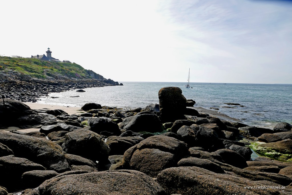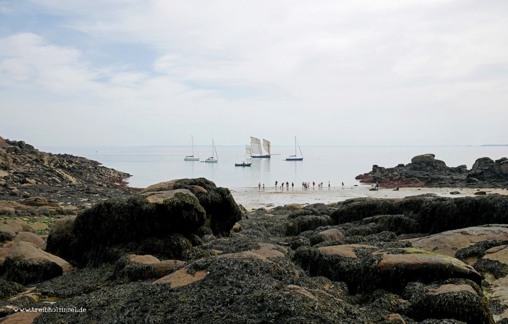 Die Landzunge, auf welcher der Leuchtturm steht, ist schnell umrundet. Von hier aus erkenne ich in der flirrenden Luft über der Bucht sogar den Mont Saint-Michel – mehr als dreißig Kilometer entfernt. Der Pfad endet wieder am Strand von Port-Marie. Das Wasser ist nun weit unten am Ende der Bucht. Einige Segelyachten ankern dort. Was im Frieden des vorsaisonalen Nachmittags malerisch wirkt, wird in der Fülle des Hochsommers zum Problem. Darum sind die drei großen Strände auf Grande Île den Touristen überlassen, während die kleinen Buchten den Anwohnern vorbehalten bleiben. Zum Baden ist das Wasser aber ohnehin noch zu kalt. Erkundungen zwischen den von Blasentang überzogenen Felsen sind aber allemal möglich. Ein Wolkenschleier hat sich über den Himmel gezogen und macht das Licht milchig-weiß, die Landschaft kaffeefarben von Latte bis Mokka. Eine neugierige Silbermöwe setzt sich zu mir auf den Felsen. Vielleicht sitze ich auf ihrem Lieblingsplatz? Wahrscheinlicher ist wohl, dass sie auf einen Leckerbissen hofft. So viel scheint sie schon gelernt zu haben über Touristen und ihre nachmittägliche Erschöpfung hier am Strand. Sie guckt etwas verlegen, als es nichts gibt von mir, und nestelt an ihrem Gefieder herum.