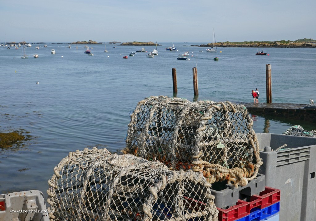 1| Aufbruchstimmung am Nachmittag von den Îles Chausey – 2| Am Schiffsanleger in Dinard haben Fischer Seespinnen für die Touristen ausgelegt