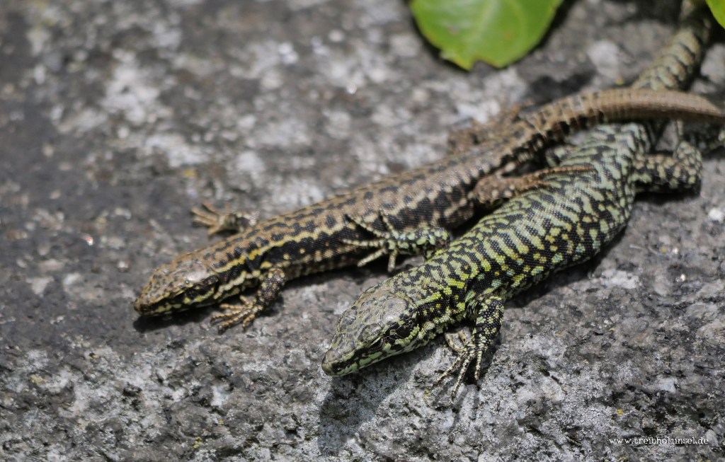 1| Zaunkönig (Troglodytes troglodytes) – 2| Mauereidechse (Podarcis muralis)