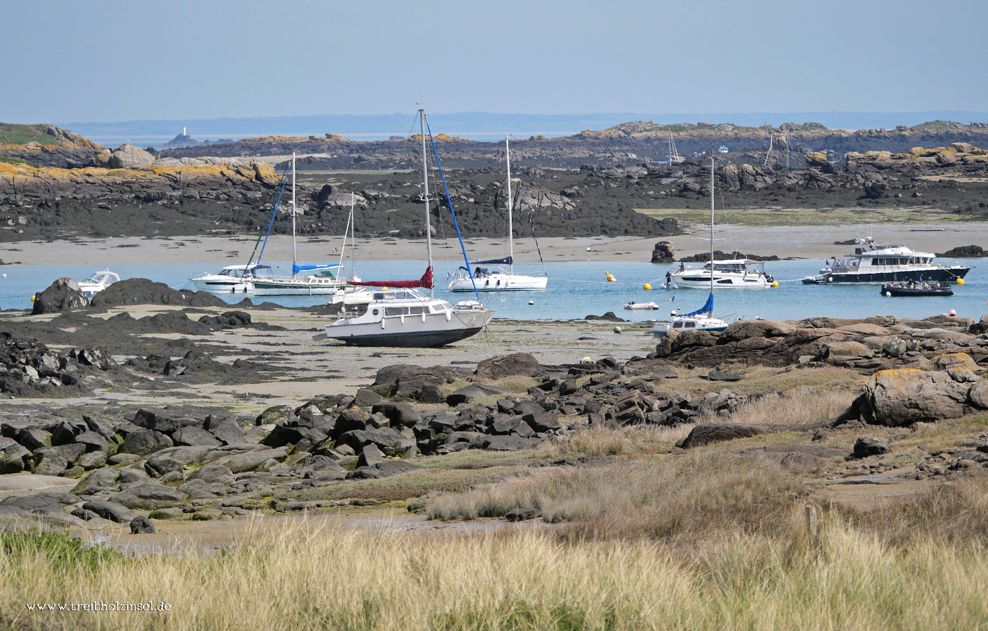 Segelboote am Strand von Port-Marie. Das zunehmende individuelle Freizeitsegeln stellt ein Problem dar. Zum einen lassen sich die Besucherzahlen nicht mehr genau beziffern, zum anderen sorgen mehr Menschen für mehr Störungen in den maritimen Naturräumen, auch durch das beliebte pêche à pied. Segelboote dürfen nur an den großen Stränden Port-Marie und Homard ankern, die kleinen Buchten sind den Chausiaises vorbehalten. Das gilt übrigens auch fürs Baden.