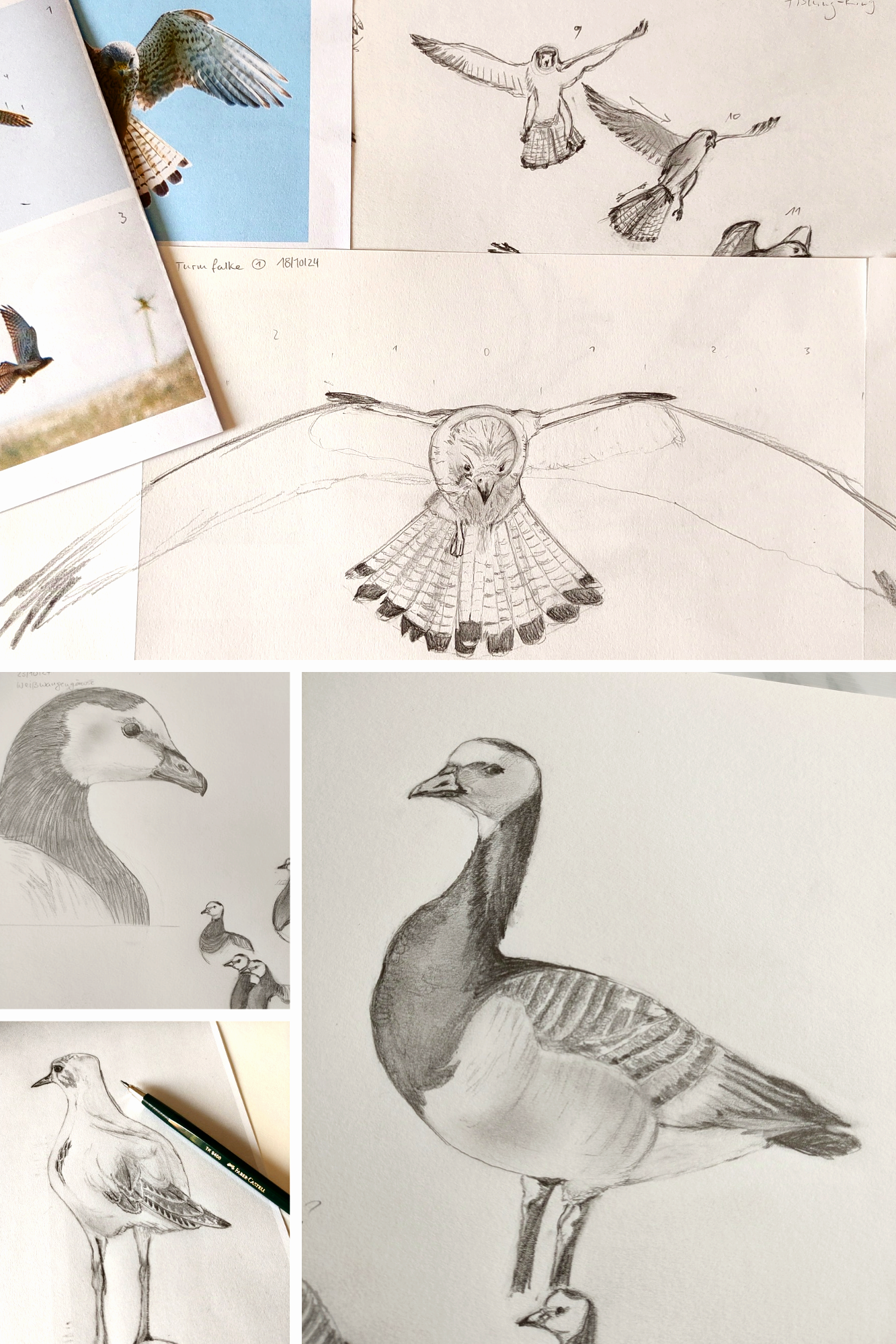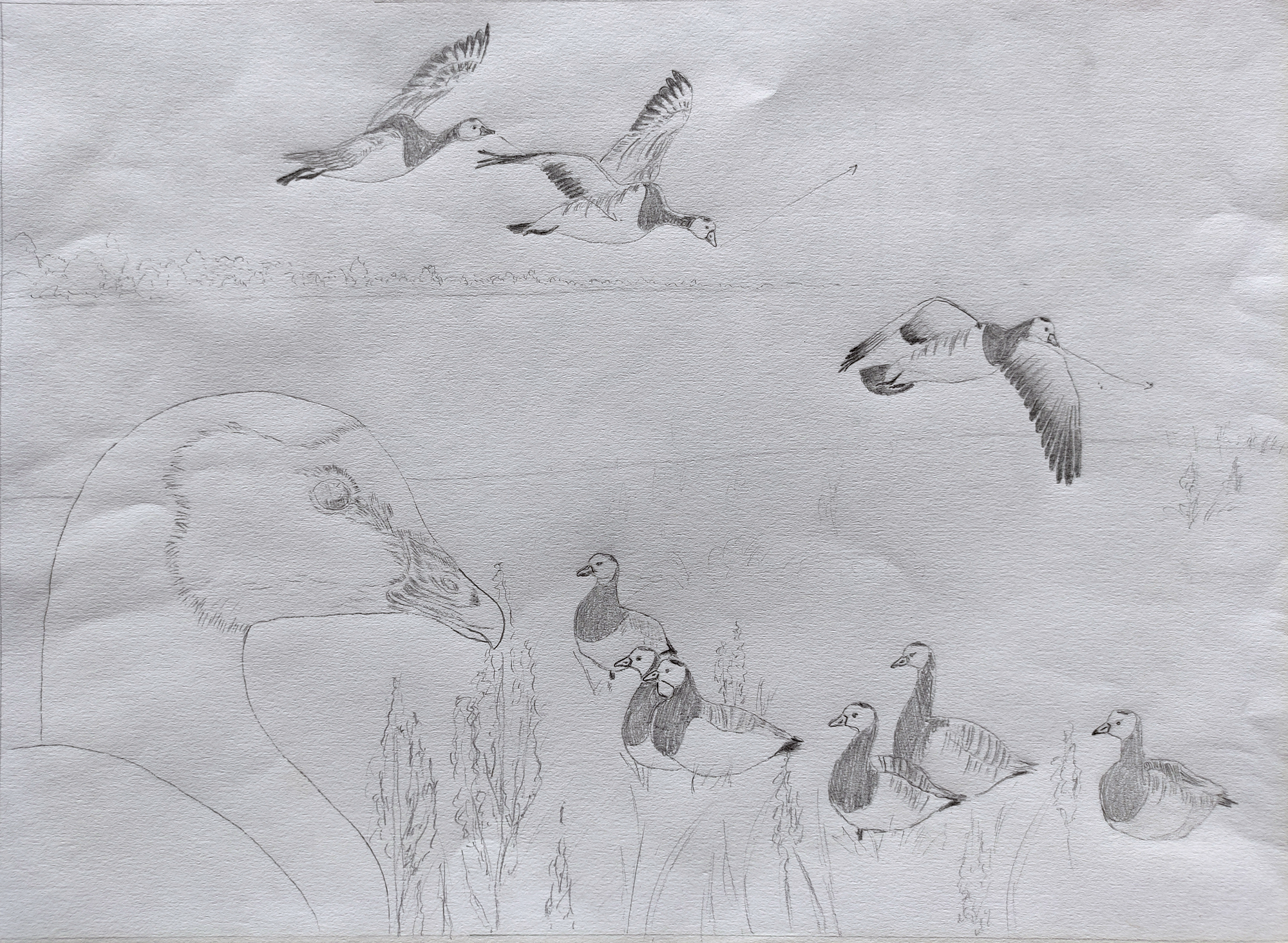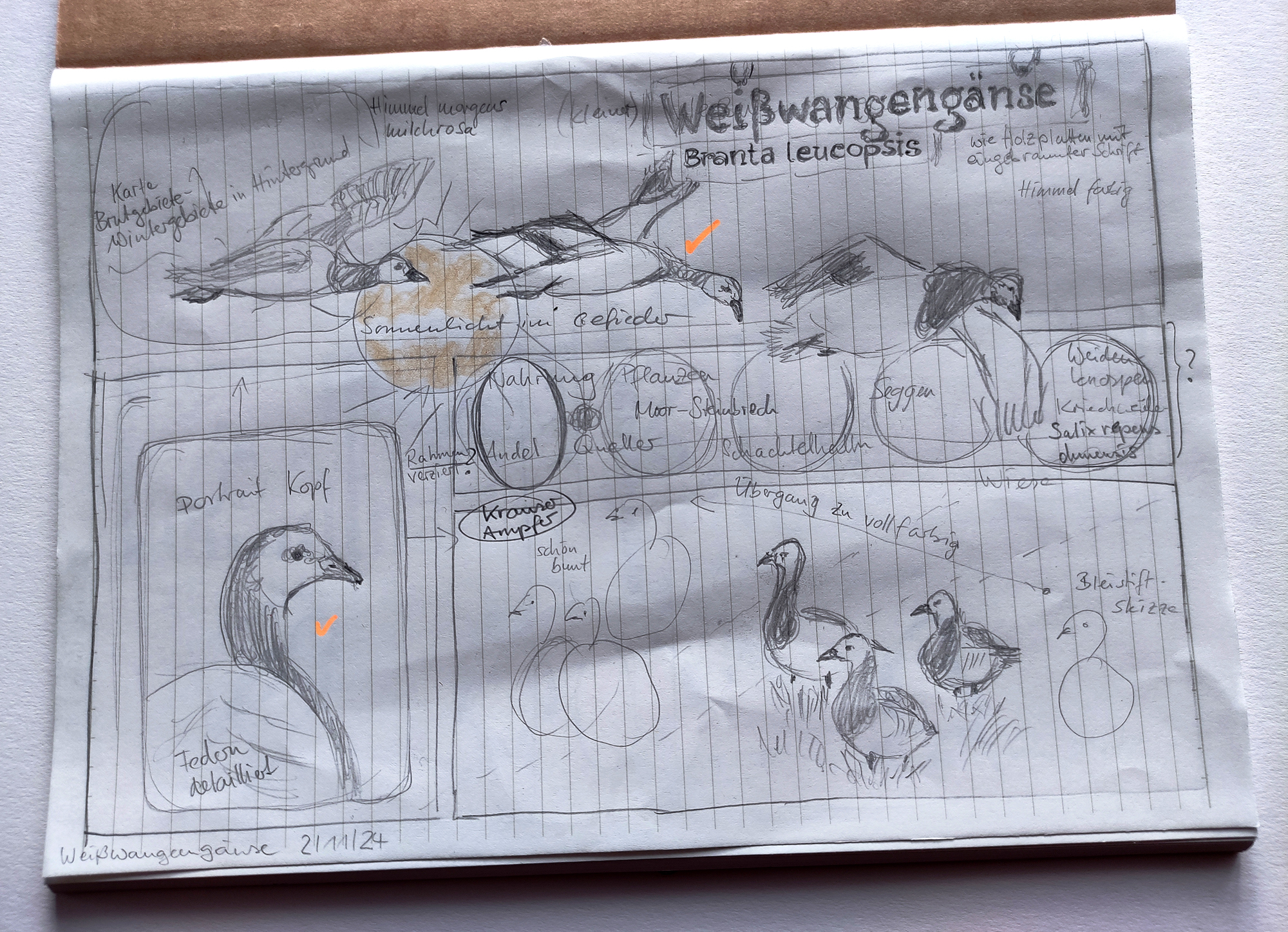 Ich habe zwar begonnen, ein Inhaltsverzeichnis zu erstellen, und in Anlehnung daran ein Storyboard, aber das hat mir anfangs nur bedingt geholfen, einen roten Faden für das Arbeiten zu bekommen. Erst als ich mich wirklich mit der Seitengestaltung befasste, kam auch meine Kreativität in Gang. Ich begann, mich mit einer Seite zur Weißwangengans zu beschäftigen. Aus einer Vielzahl an Skizzen, die dabei zunächst entstand, wollte ich im nächsten Schritt eine morgendliche Szene komponieren… die Sonne geht auf, der herbstliche Nebel liegt noch über der Bucht, ein bisschen Vegetation… aber das Bild entwickelte sich zunehmend in eine andere Richtung.