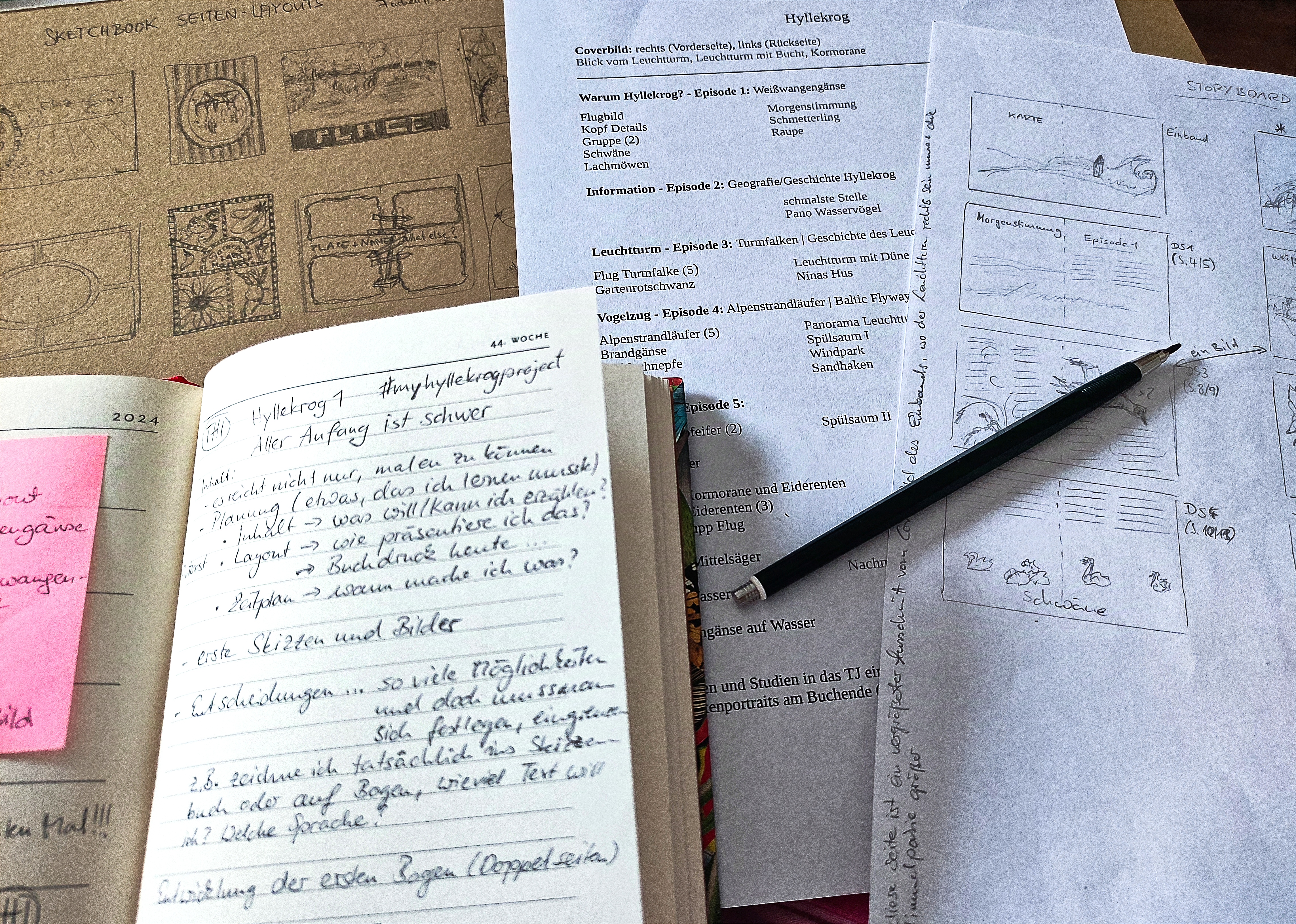 Die Idee mit dem Hyllekrog Travel Journal kam mir irgendwann im Sommer 2024. Ich wollte vor allem einfach viel mehr zeichnen und es schien mir hilfreich, mich an etwas Größerem zu versuchen. Etwas, das eine Weile dauern würde und an dem ich trotzdem viel ausprobieren und lernen könnte.