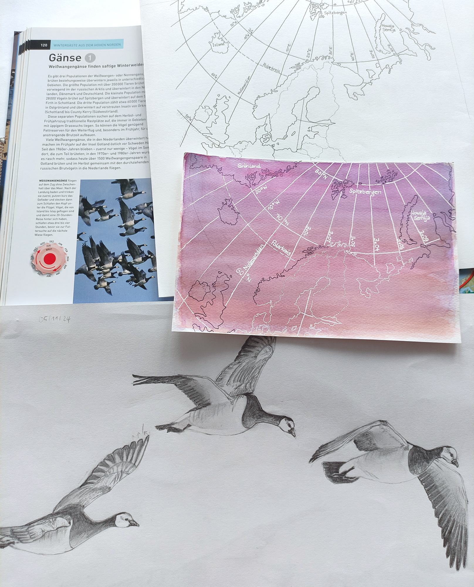 Als ein Hintergrundthema bot sich der herbstliche Vogelzug an, der die Gänse jedes Jahr nach Hyllekrog führt. Ich recherchierte nach den Zugrouten und fand heraus, dass es drei Populationen der Weißwangengänse gibt, die an weit entfernten Orten brüten und überwintern und sich praktisch niemals begegnen. Ich versuchte das Thema grafisch zu erarbeiten.