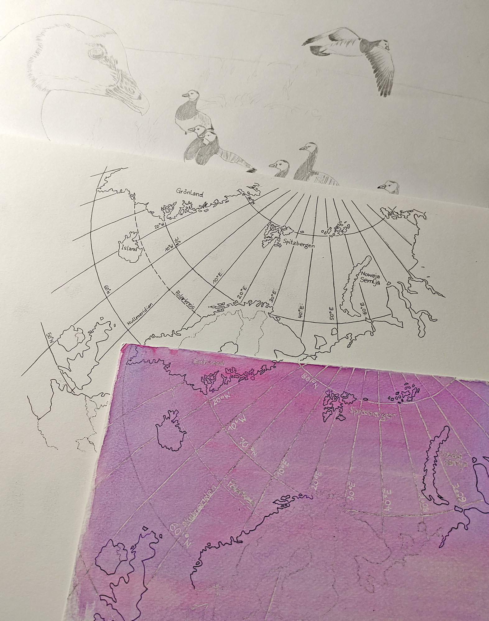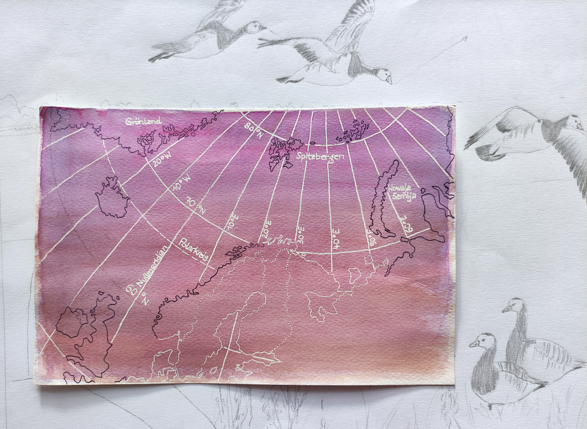 The autumn migration that brings the geese to Hyllekrog every year was a suitable background topic. I researched the migration routes and found out that there are three populations of barnacle geese that breed and overwinter in distant places and practically never meet. I tried to work out the topic graphically.