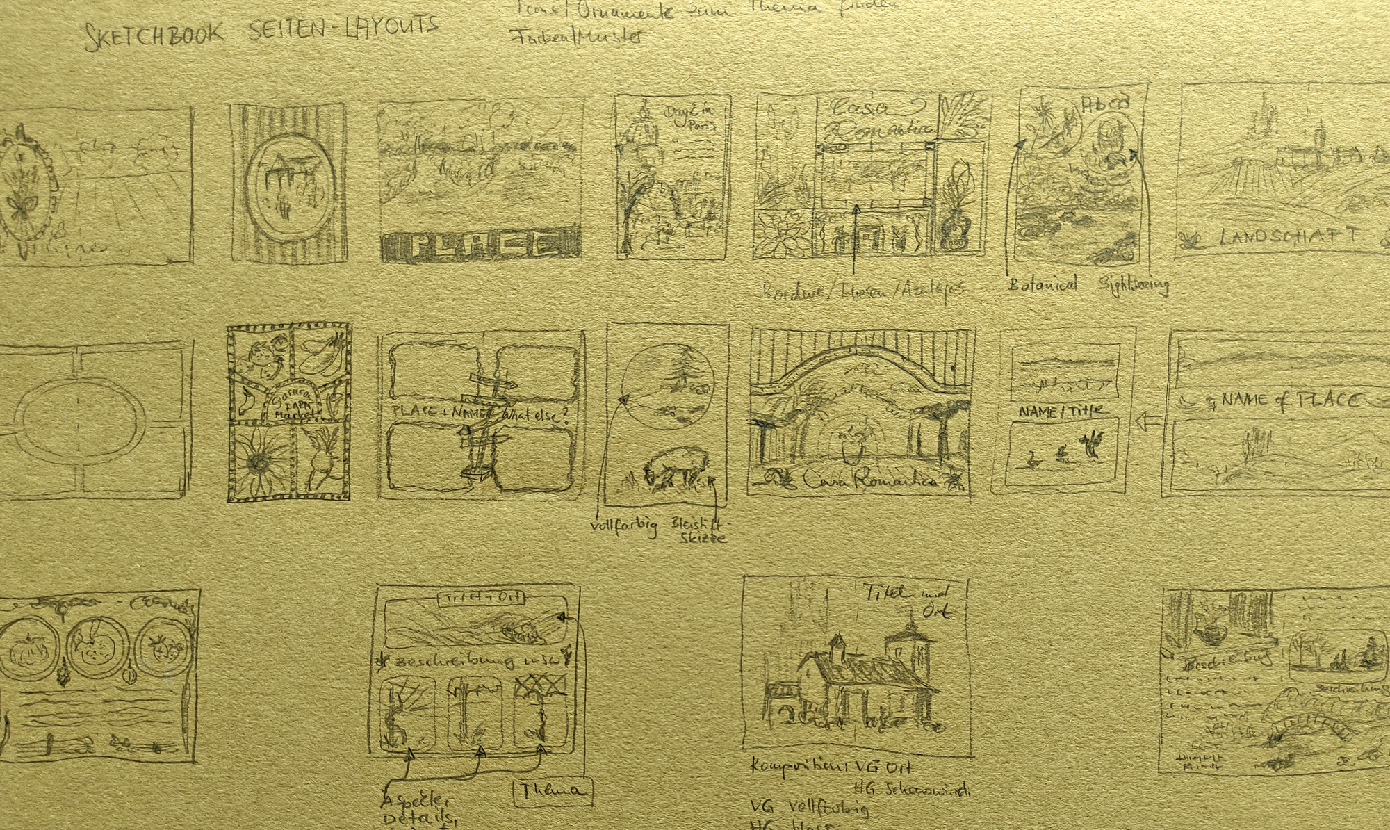 Die ersten Ideen waren ziemlich zusammenhangslos, als hätte jemand in meinem Kopf eine Schachtel Puzzleteile ausgeschüttet. Ich durchforstete meine Festplatte nach Bildmaterial, begann zu skizzieren und recherchieren. Und merkte schnell, dass ich unbedingt einen Plan brauchte, denn einzig malen zu können, reicht nicht aus.