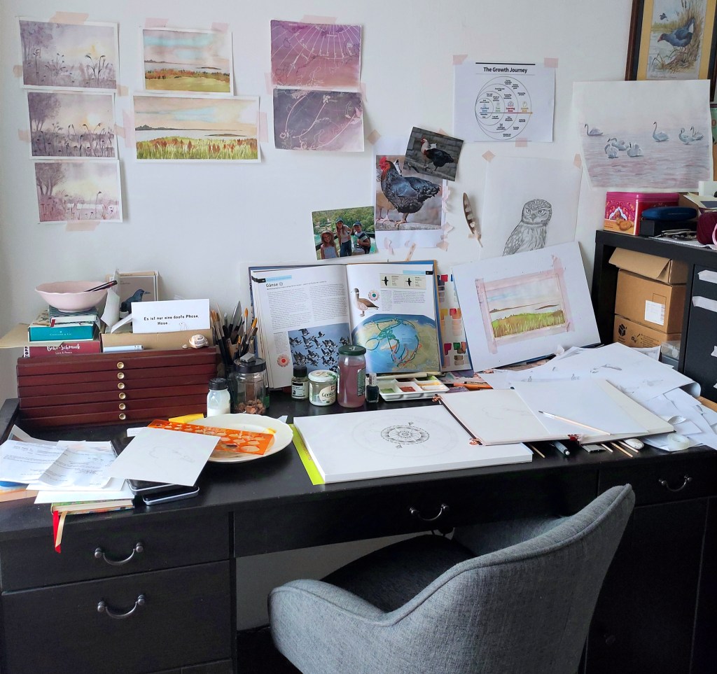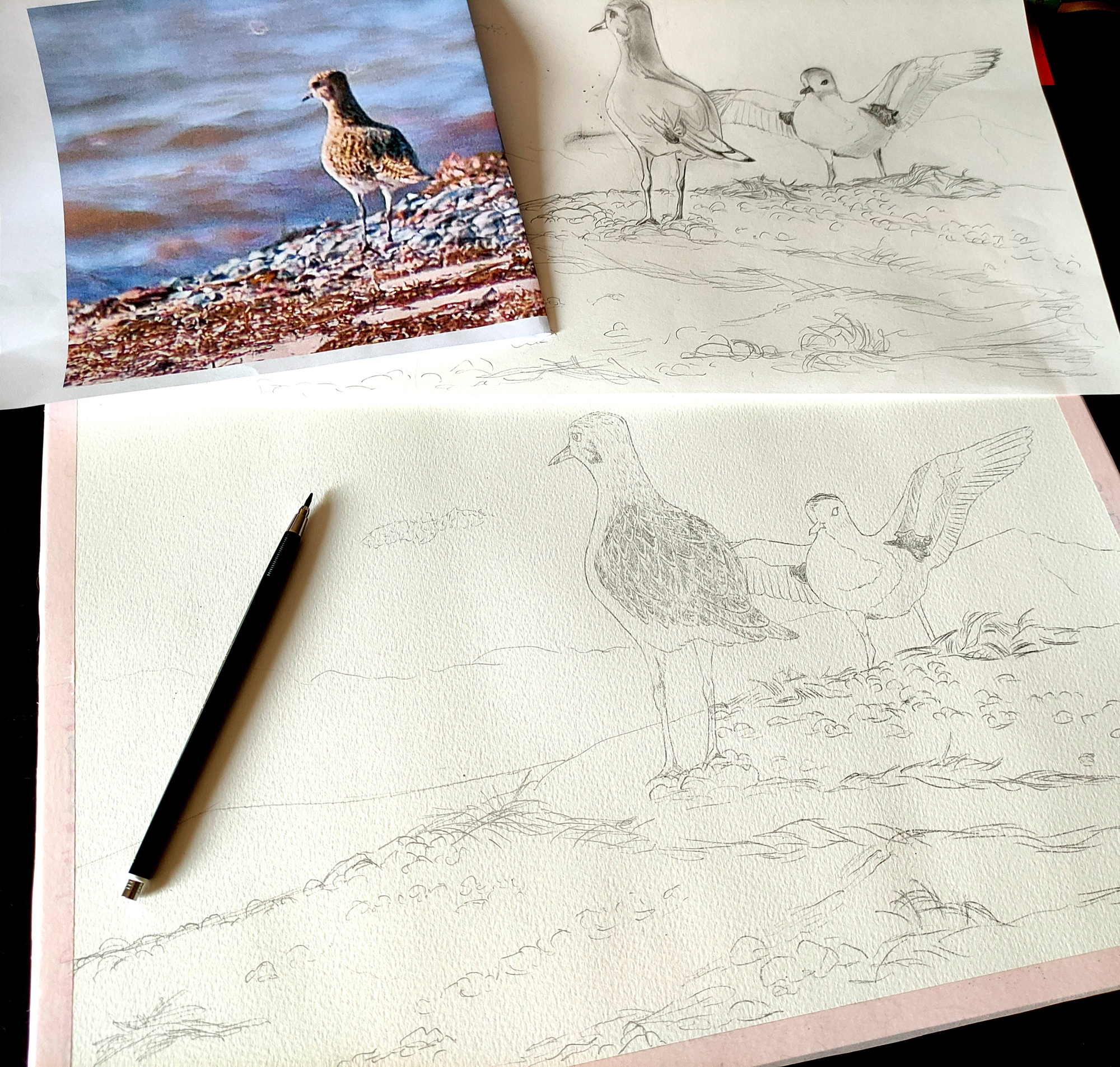 I did start to create a table of contents and a storyboard based on it, but at first this only helped me to a limited extent to get a common thread for my work. It wasn’t until I really got to grips with the page design that my creativity got going. I started working on a page about the barnacle goose. The next step was to compose a morning scene from the many sketches that initially emerged… the sun is rising, the autumn mist is still over the bay, a little vegetation… but the picture increasingly developed in a different direction.