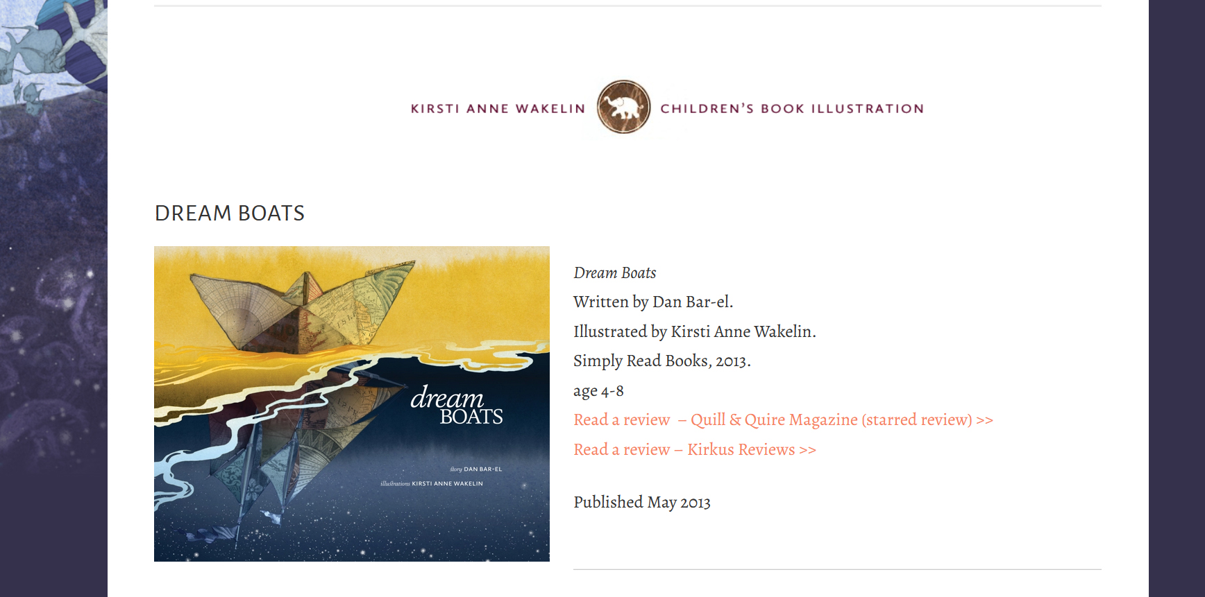 A few years ago, I stumbled across an interesting web blog. The Canadian artist Kirsti Anne Wakelin illustrated several children’s books, including ‘Dream Boats’ by Dan Bar-el. On the blog mysecretelephant.com she describes the work process, which took over 3 years. It was incredibly exciting for me to learn how page after page was conceived, developed and realised by her. In the end, I bought ‘Dream Boats’ because I was so impressed by her work. But now the time span of 3 years is what inspires and encourages me to keep working on my own project. And even more: to have the time for it, no matter how many years it may take.